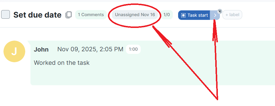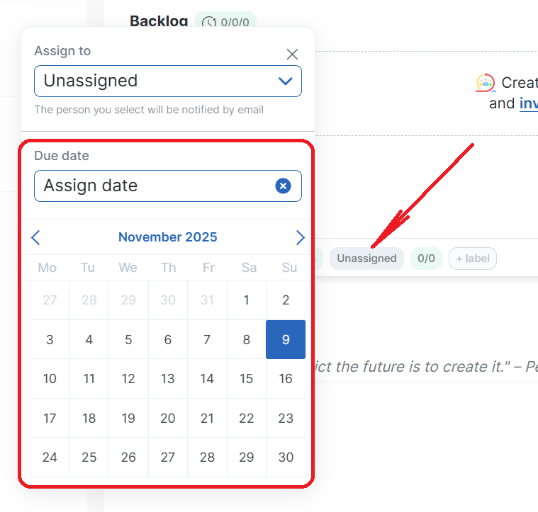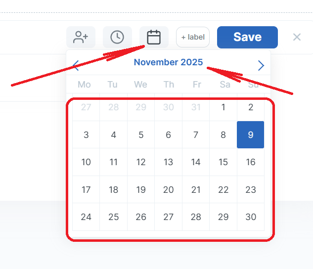 You can set due dates for tasks to plan the task completion date. This feature will help organize work on tasks within a project, reducing errors and saving time. To set the due date when creating a task, please press the schedule icon, select a month, and then choose a date: