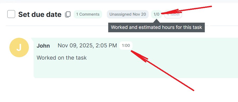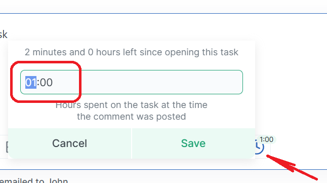 When an employee works on a task, he can indicate the amount of time spent working on the task in his comment. To do this, the employee should press the clock icon and enter the time amount.