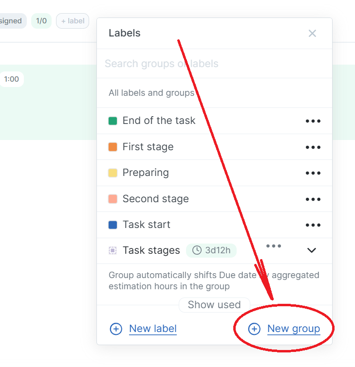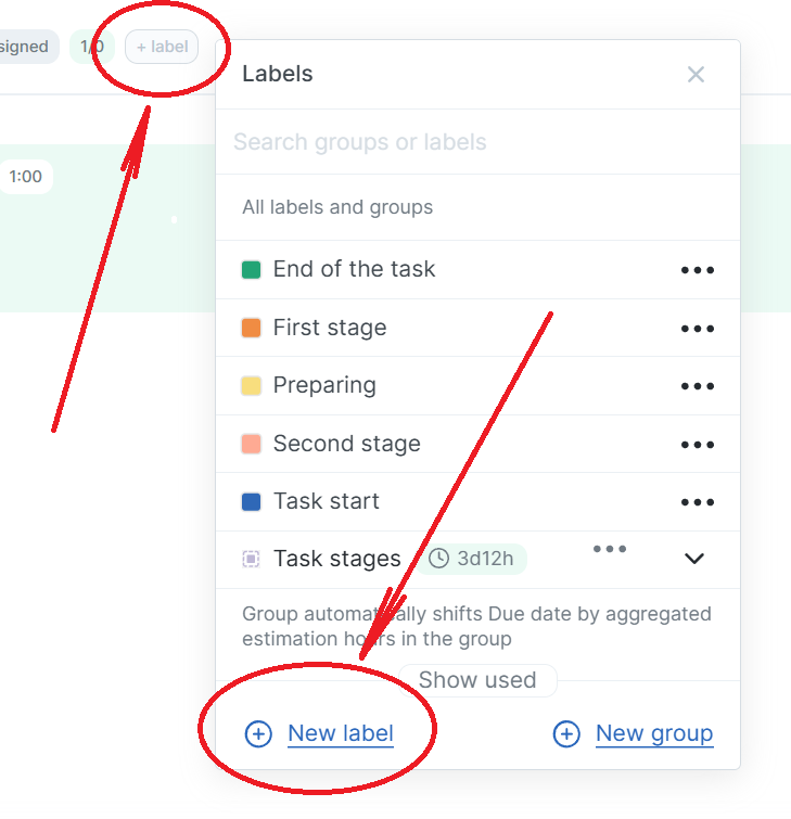 To automatically set a due date for a task, you can use a group of labels. First, please create labels for your group by pressing the ‘+ label’ on the right of the task name. Then press ‘New label’: