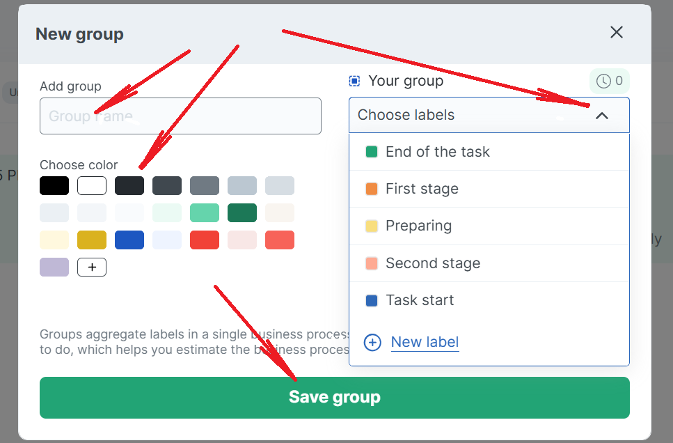Enter the group name, choose the group colour, select the needed labels, and press the ‘Save group’ button: