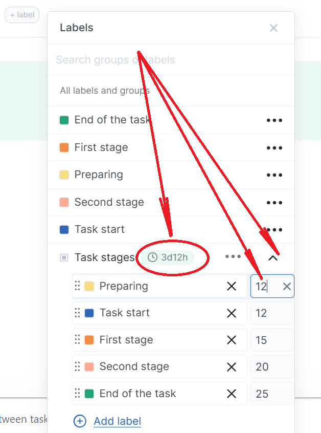 After that, in the Labels interface, you can set the hours for each label in the group. The sum of hours for all labels will be displayed to the right of the group name.