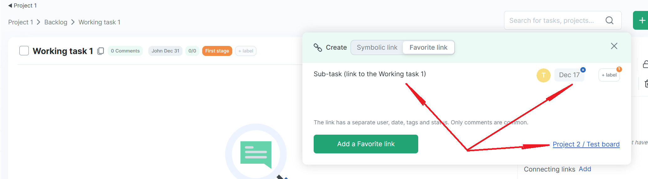 Symbolic link - fully connected link. Has the same assigned person, due date, and label. Changing these attributes will reflect on the original task.