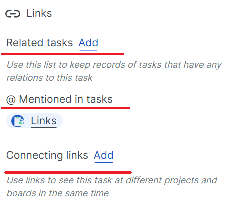 Here you can find automatically added mentions of this task in any other task. If someone sends a message with the link to the task, the cross-link is added to the mentioned task.