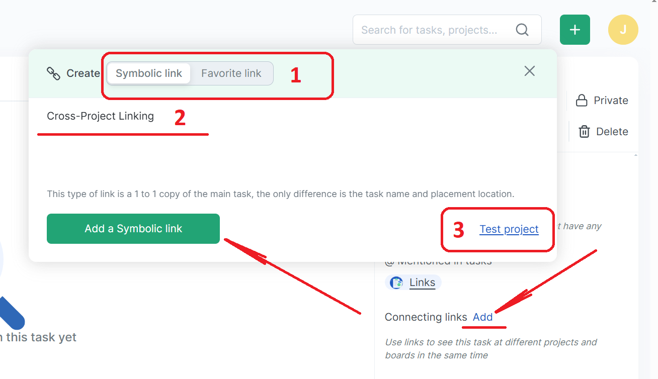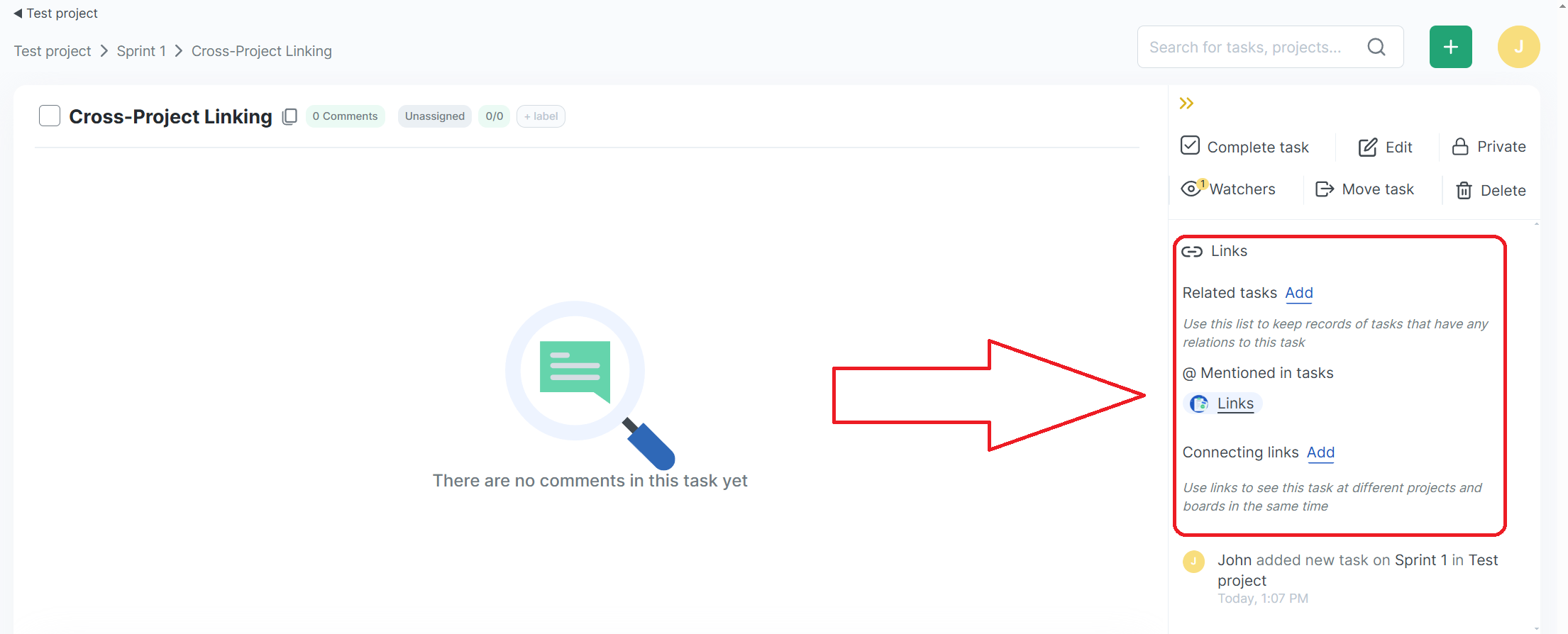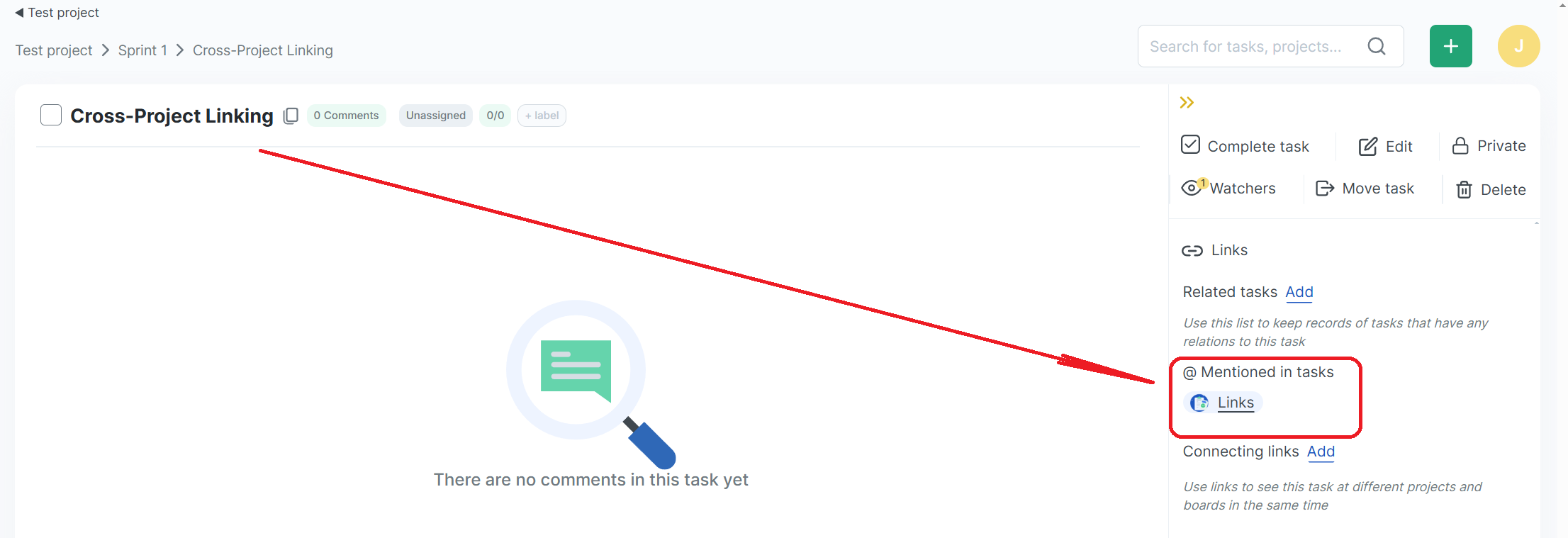 To help you manage complex tasks, we added the Cross-Project Linking feature. You can connect tasks across different projects to establish relationships and dependencies. Each task has a “Links” section on the right.