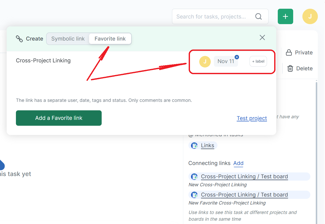 Favorite link - independent link. May have its own assigned person, due date, and label. Changing these attributes will not reflect on the original task.