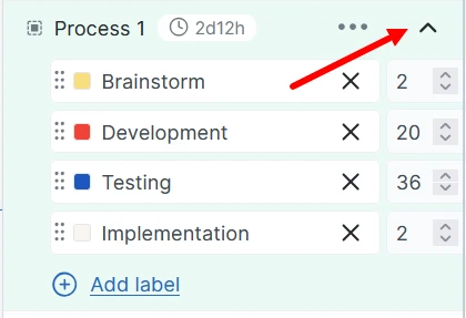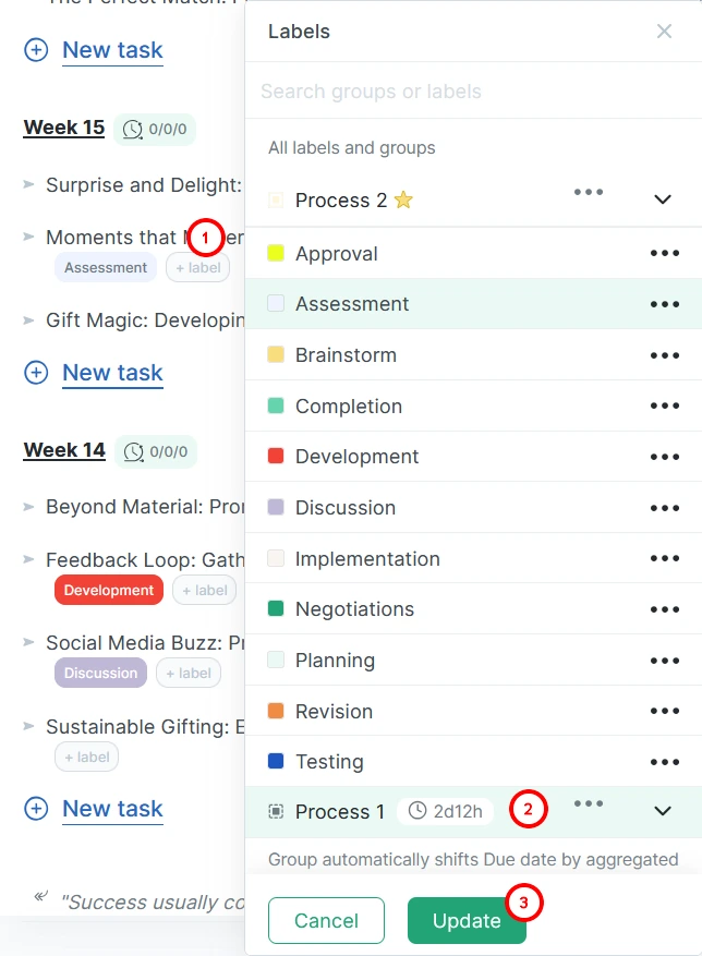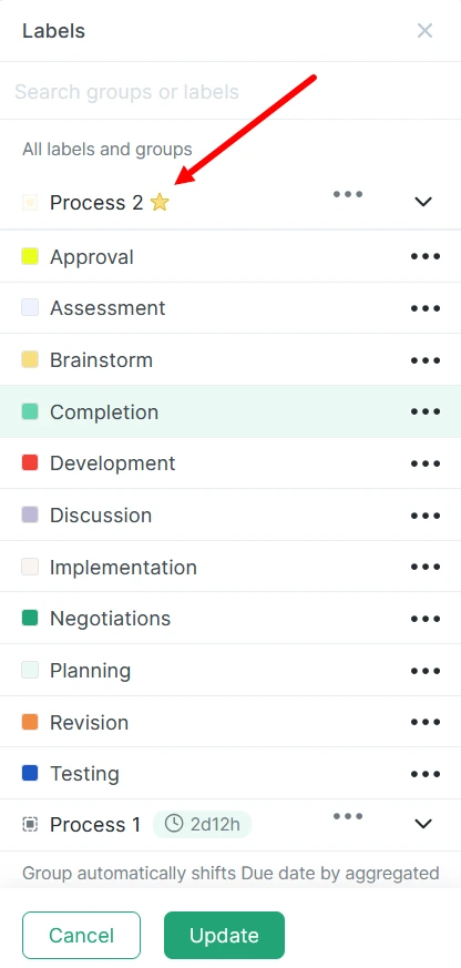 Next to the task name, click the “+ label” button, select a label group from the list, and click “Update.”