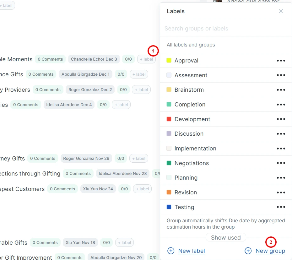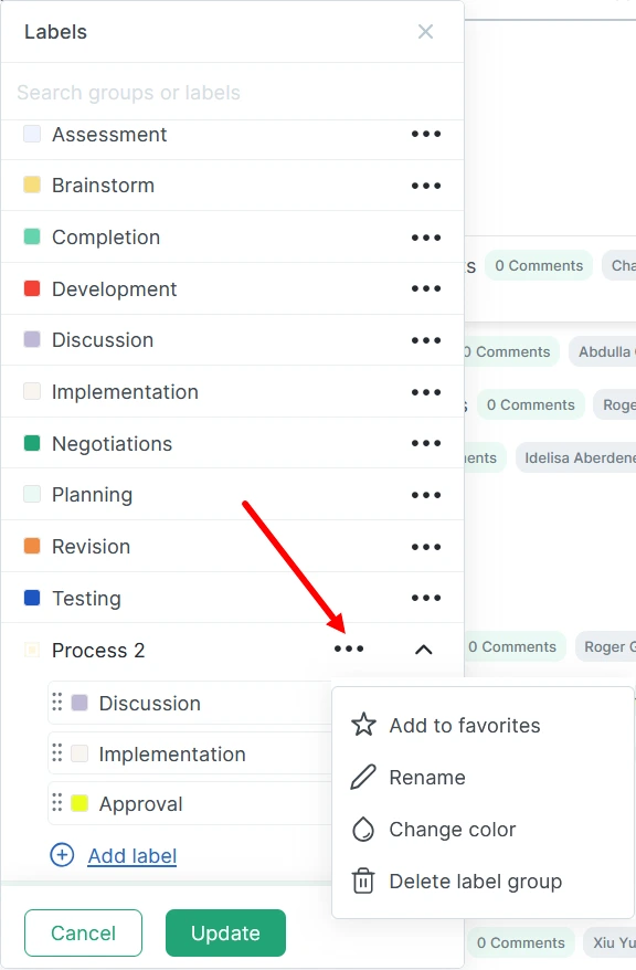 Next to the task name, click the “+ label” button, find the desired group, and click the three dots next to the group name. Using the drop-down menu, you can: