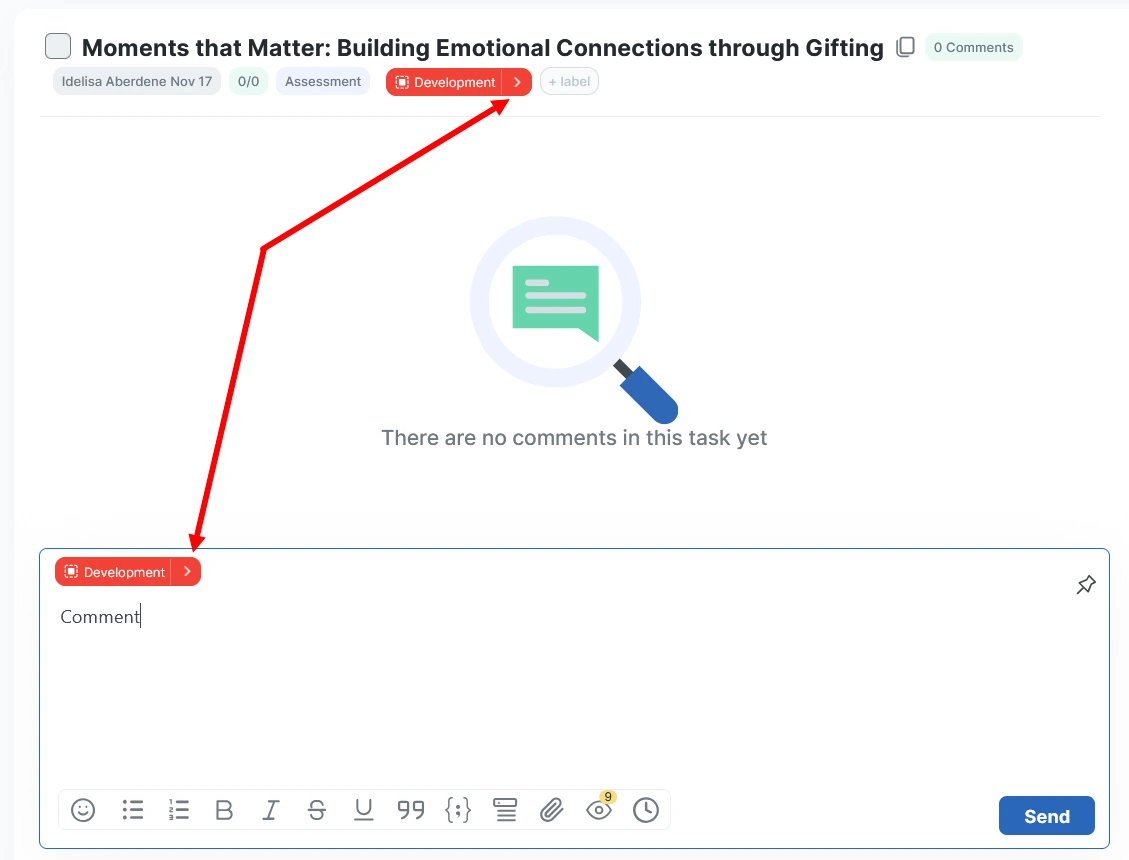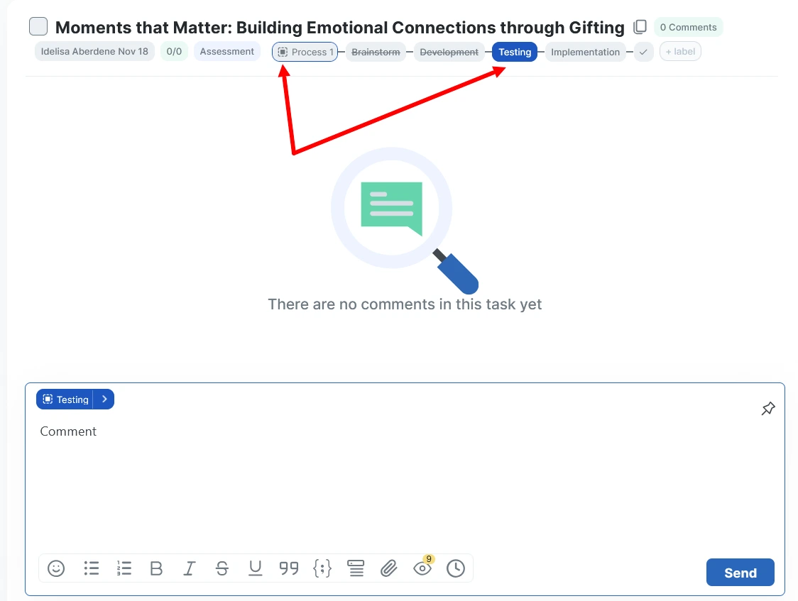 Click the right arrow on the group icon. This will move the task to the next stage. At the same time, you will be prompted to write a comment.