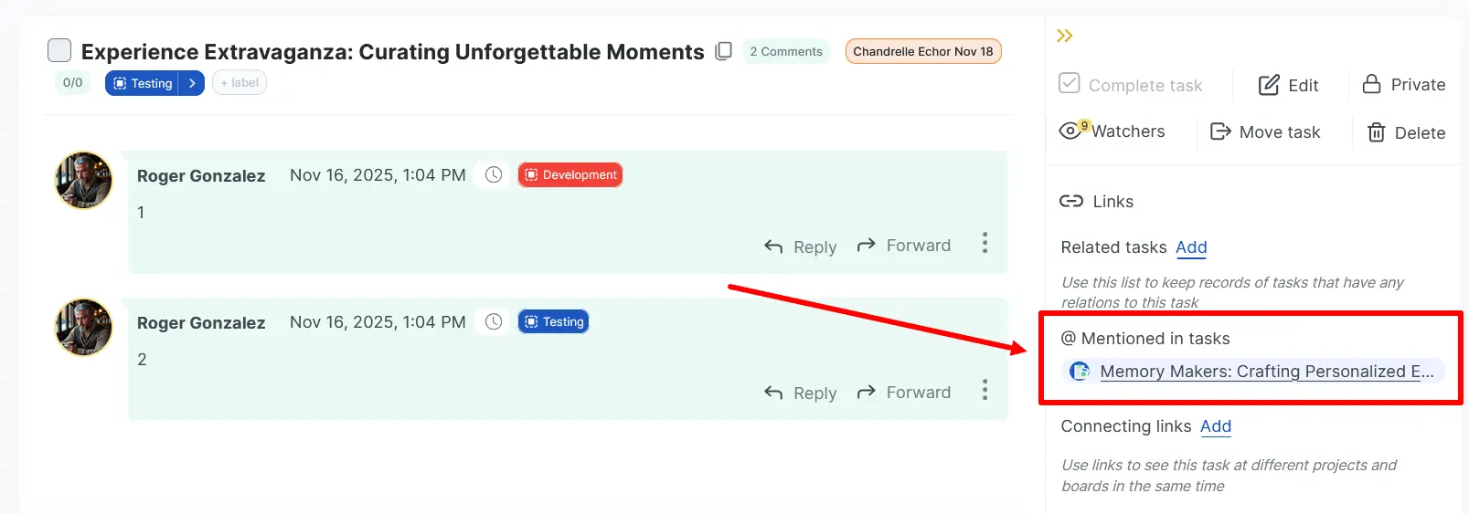 When the comment is posted, a link will appear in the selected task in the “@ Mentioned in tasks” section.