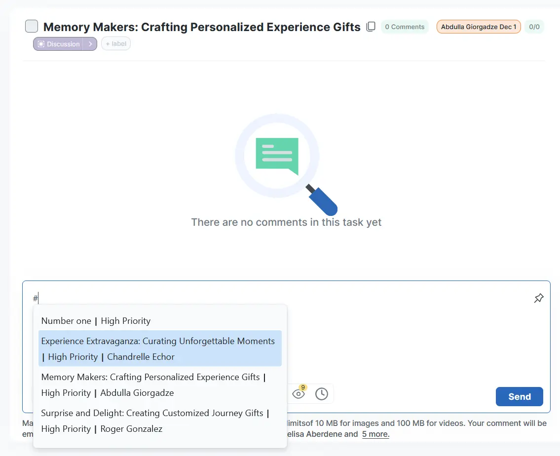 By clicking on the # symbol in the comment field, you can select the task you want to refer to. When you enter characters after #, tasks matching the text you entered will be suggested.