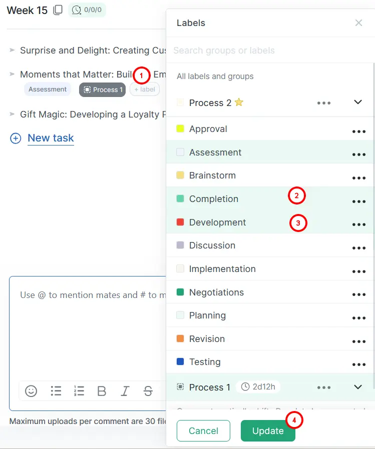 Next to the task name, click the “+ label” button, select the labels from the list that you want to add or remove, and click “Update.”