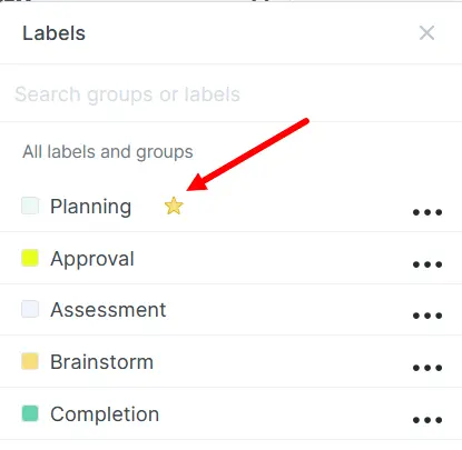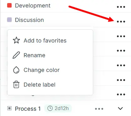 Next to the task name, click the “+ label” button, find the desired label, and click the three dots next to the label name. Using the drop-down menu, you can: