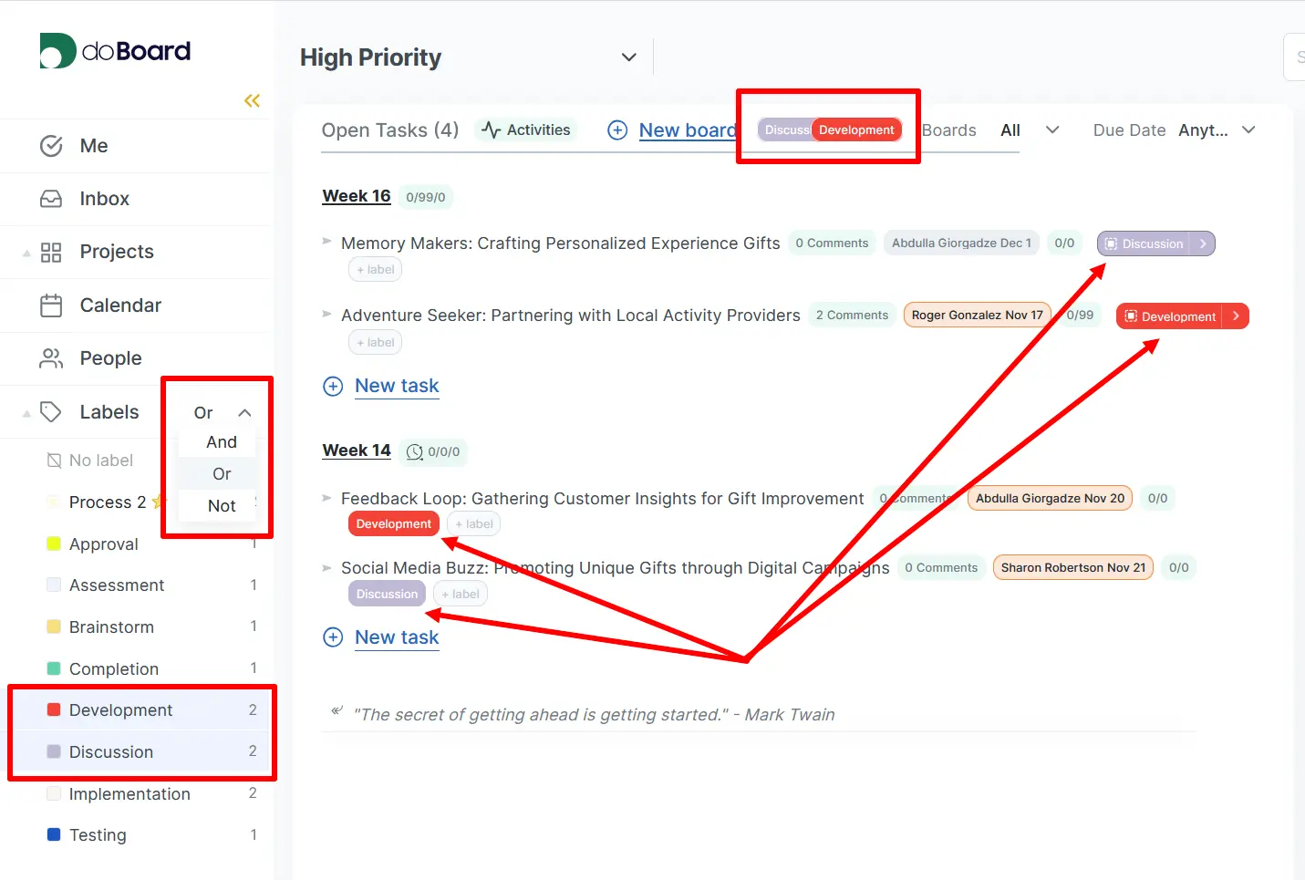On project pages, boards, and the member page (Me), you can filter tasks by labels. Select a label, and only tasks with that label will remain in the list.