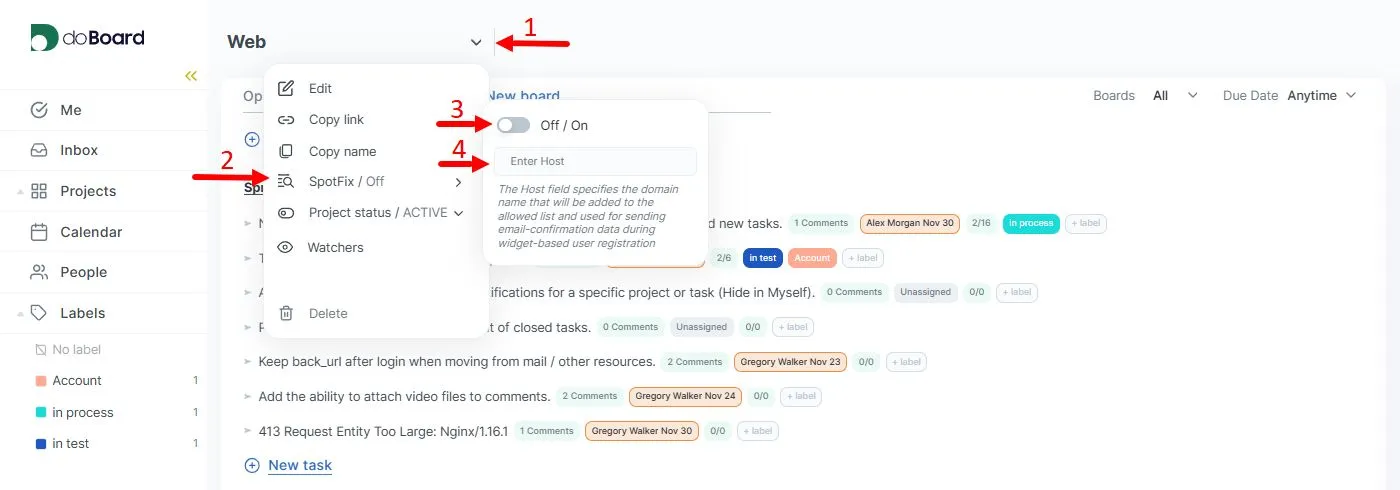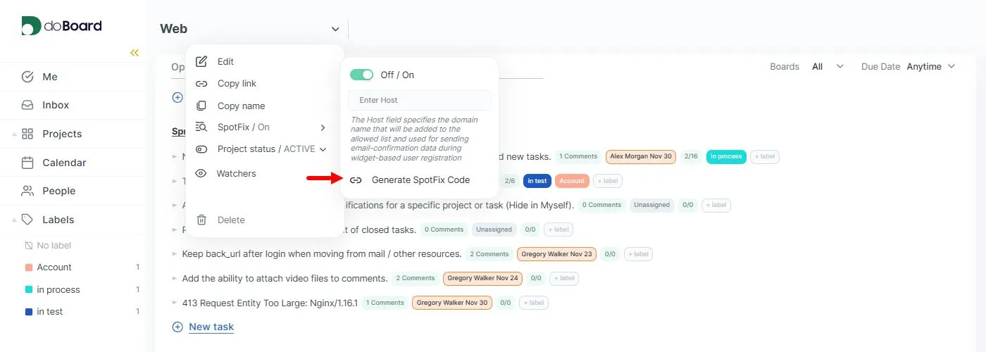 SpotFix is a lightweight on-page widget that allows visitors, editors, and team members to highlight text or page elements and submit quick, contextual feedback — a Spot — directly tied to the exact location on the page. Each Spot is automatically turned into a task in doBoard for tracking, discussion, and resolution.