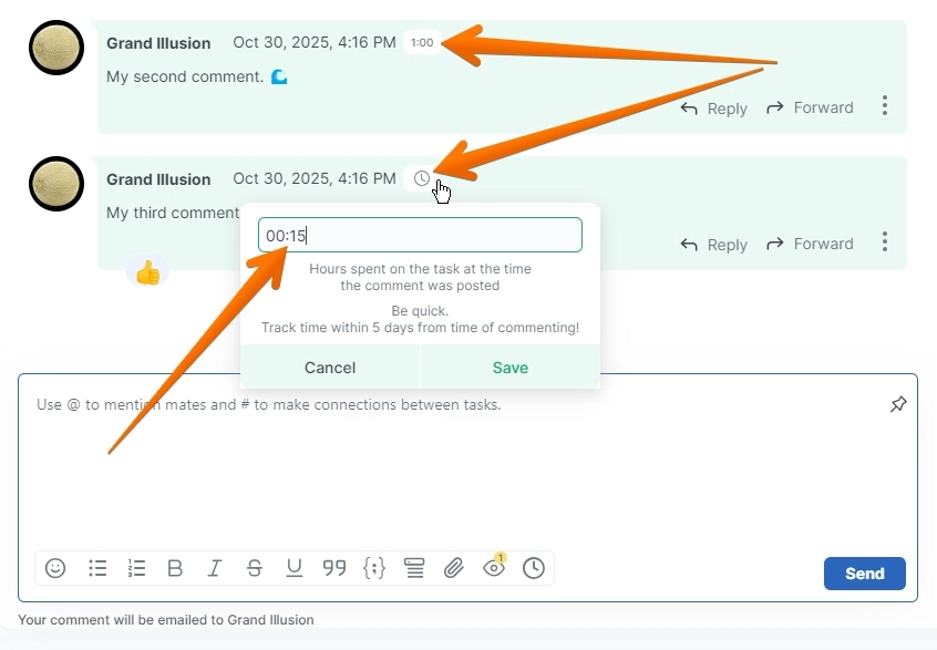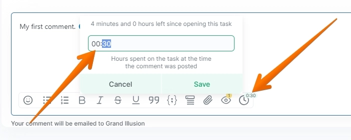 Click it, set how many hours/minutes were spent, then post your comment.