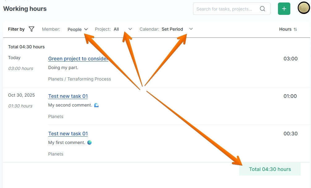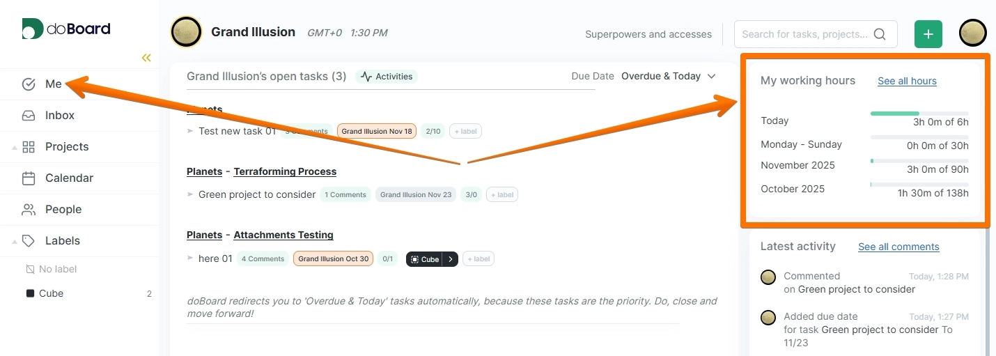 Your page Me has a panel My working hours with the following sums of your spent time: