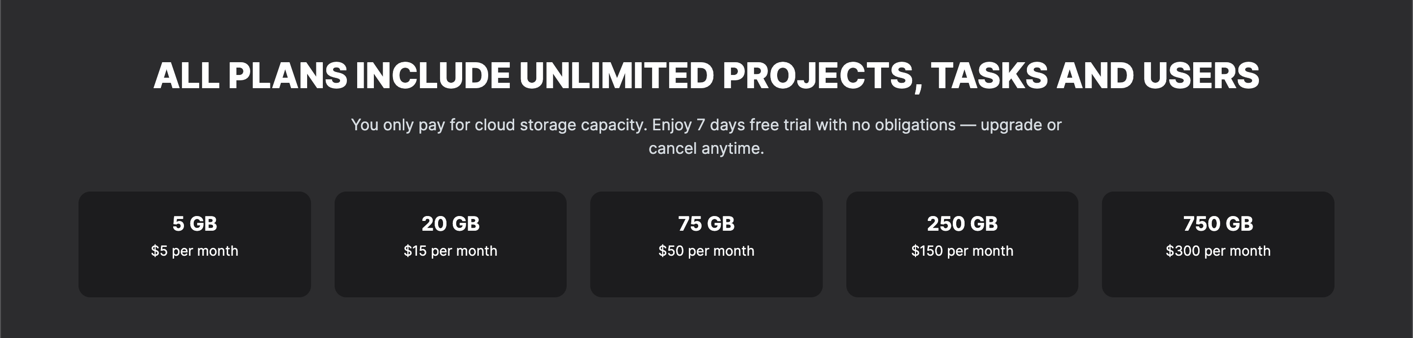 There are 5 plans that differ in the amount of storage space (in GB) in the cloud. All plans include unlimited projects, tasks and users.